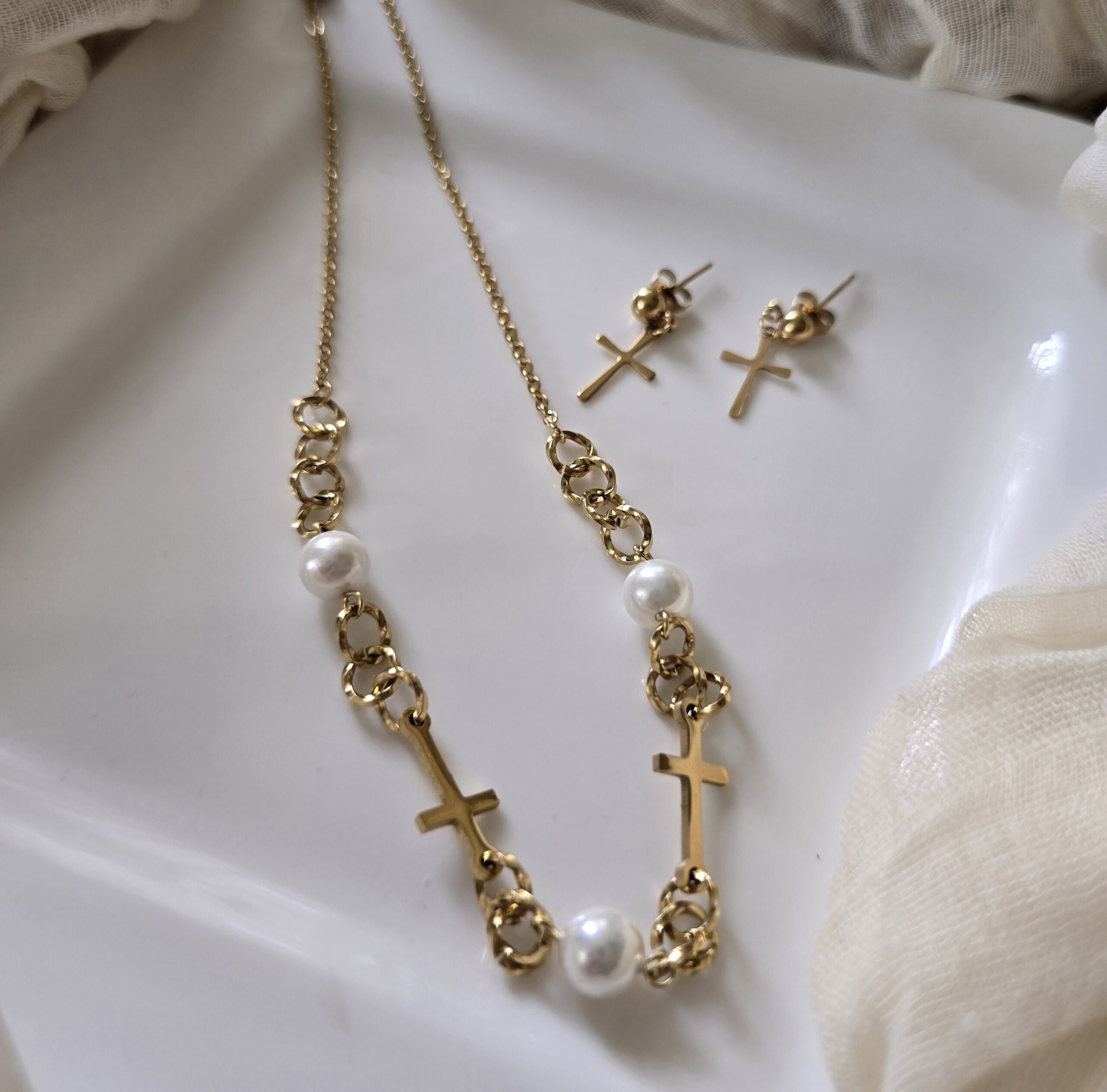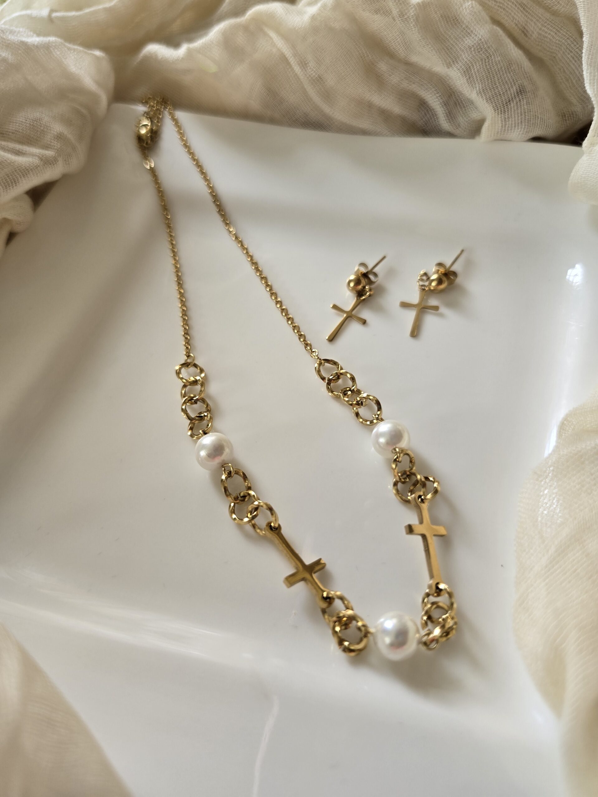 Cadena dorada en acero inoxidable con perlas blancas y varias cruces.