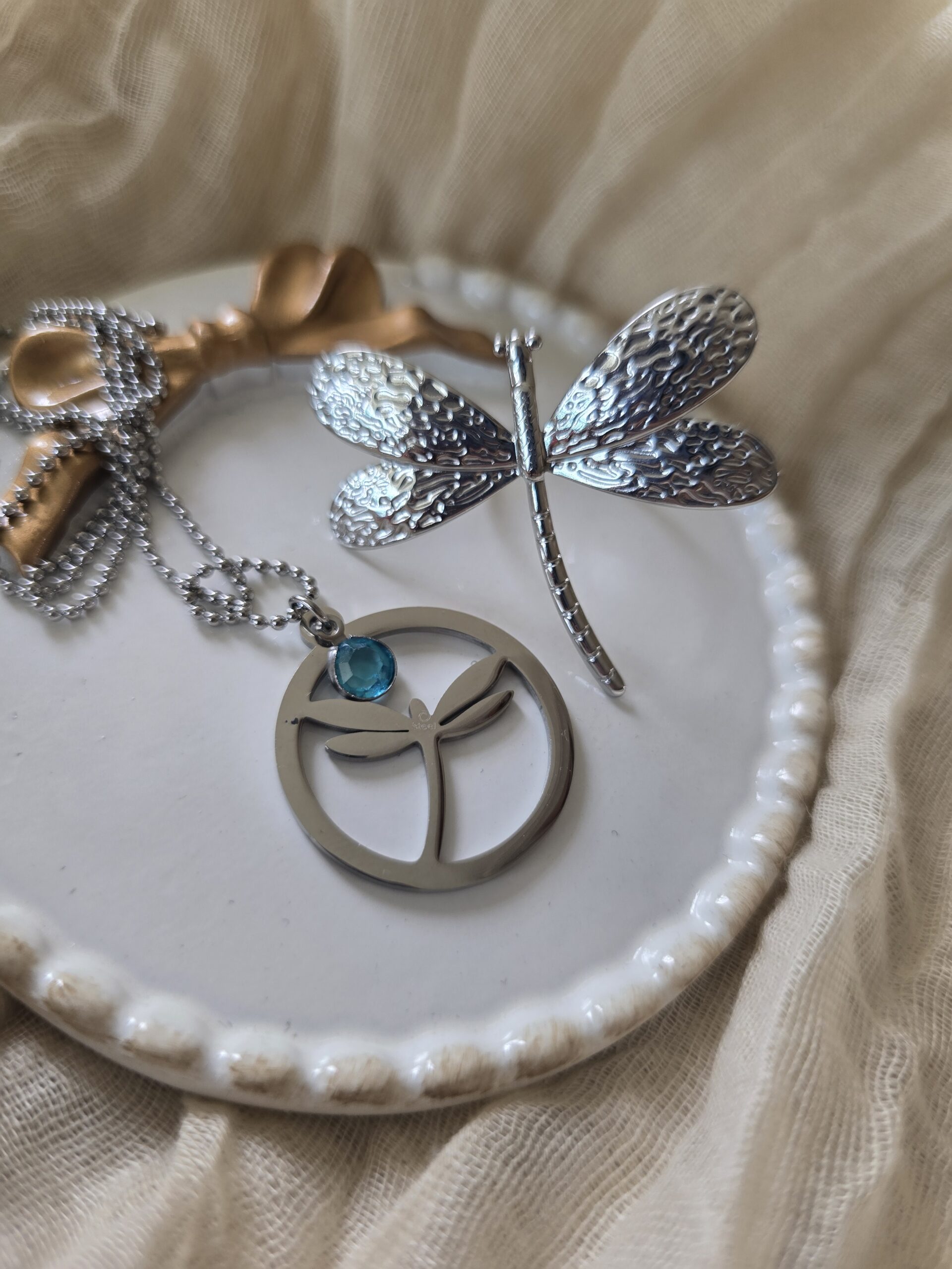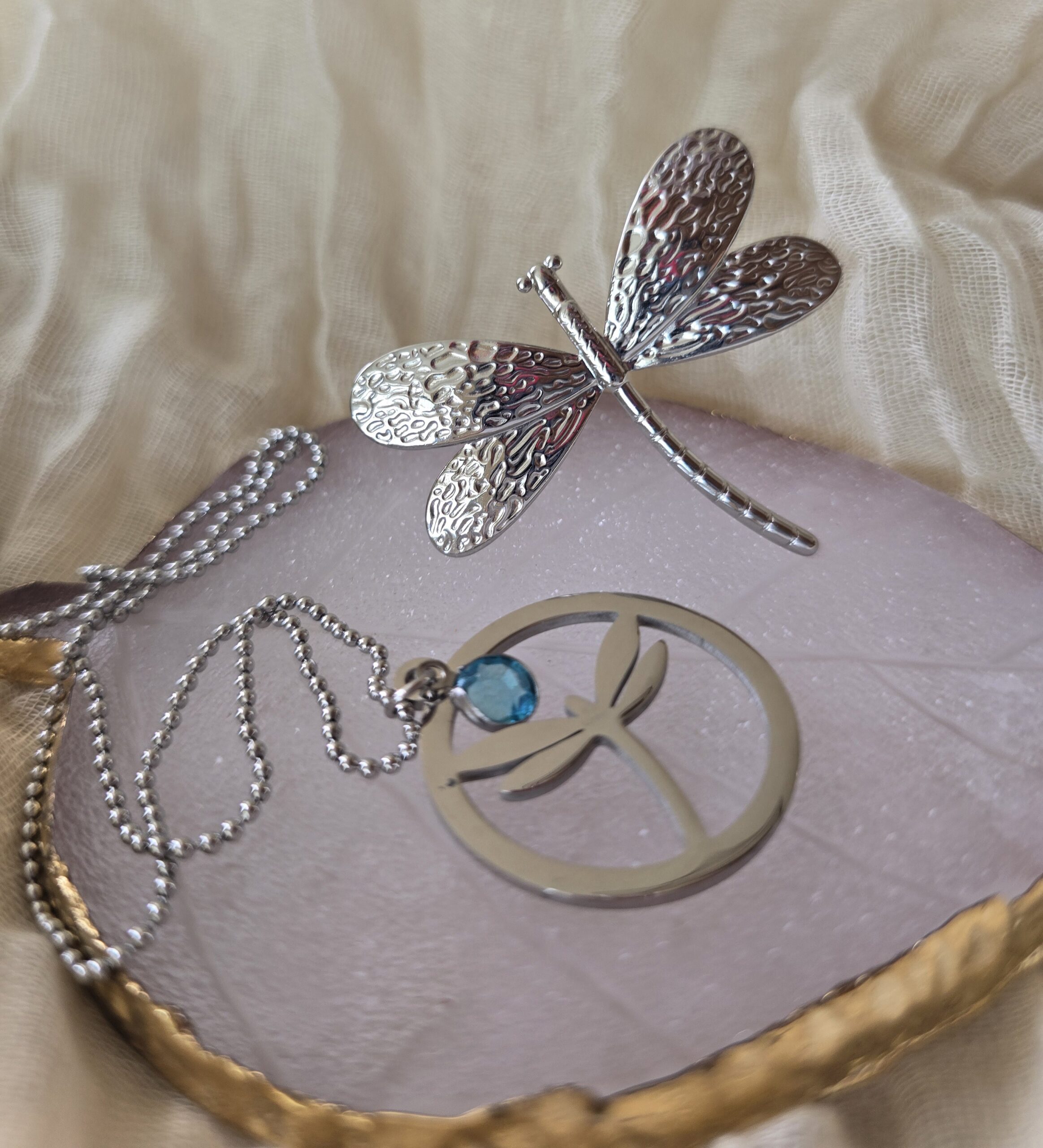 Conjunto plateado con cristal ahul colgante.
