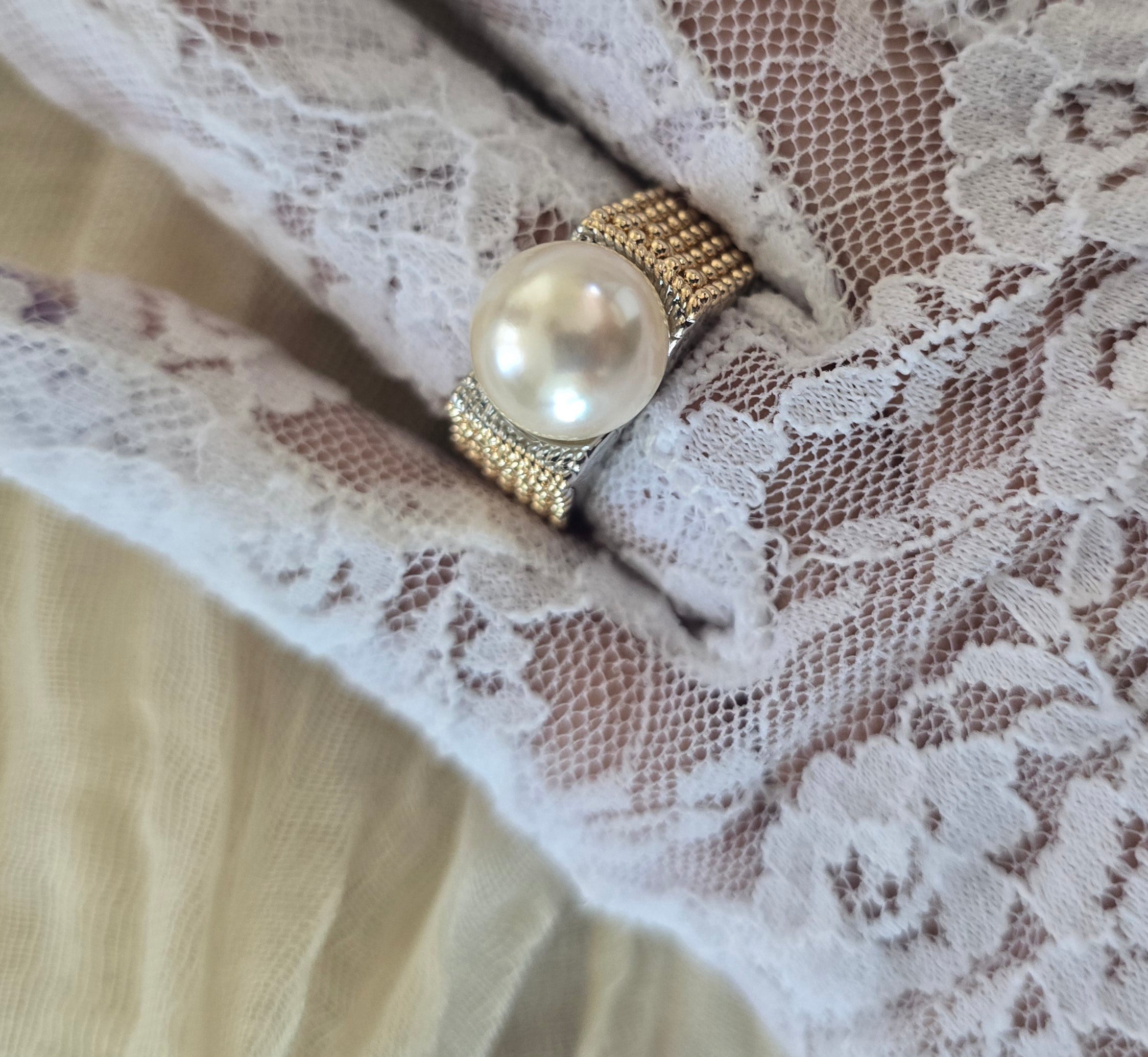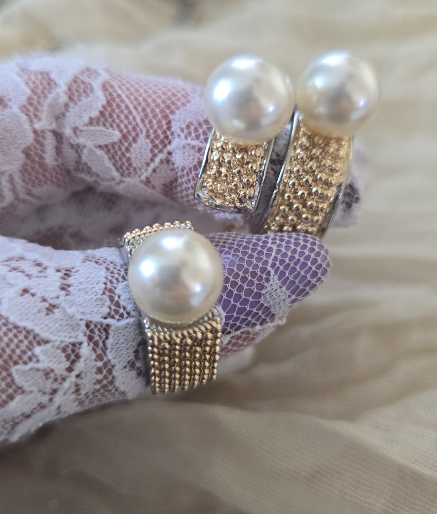 Descripción: Conjunto hermoso sortija y pantallas estilo turco con perla natural blanca, en acero inoxidable.